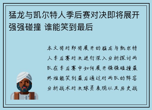 本文将对即将展开的猛龙与凯尔特人季后赛对决进行深入分析,探讨两队在季后赛中如何展开强强碰撞,最终谁能笑到最后。通过对两队的阵容分析、战术对决、球员表现以及历史战绩的综合考量,本文旨在为球迷们呈现一场激...